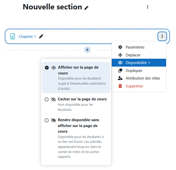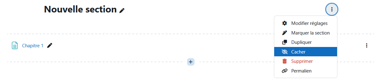Vous pouvez également cacher/afficher une section de votre cours (toutes les activités présentes dans la section seront cachées) :