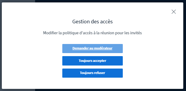 • “Toujours accepter” = Toute personne ayant le lien d'invitation accède directment à la salle.