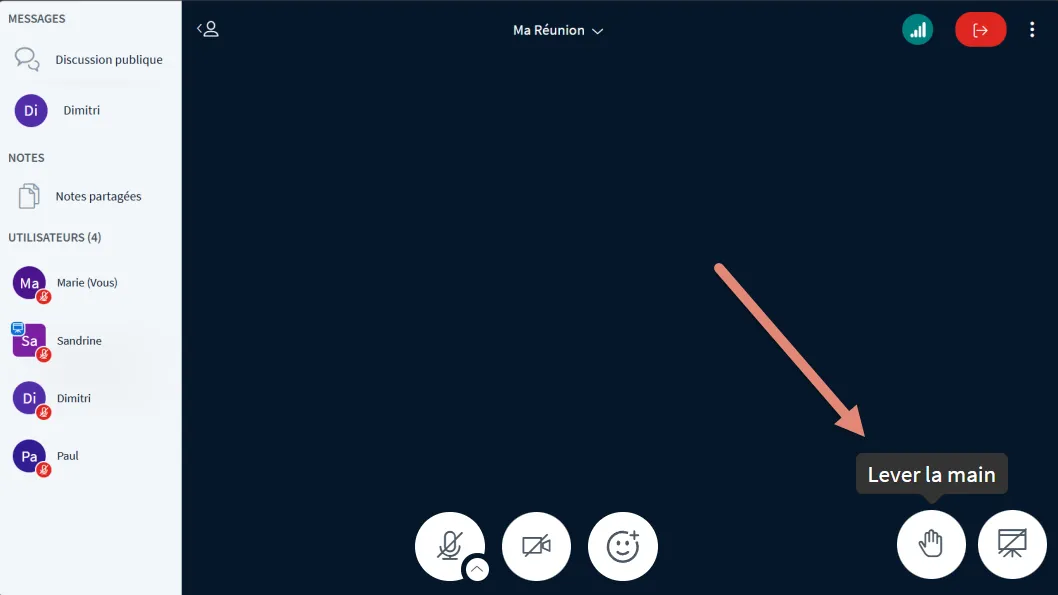 Les participants sont avertis par un signal sonore et par l’affichage de votre nom accompagné de l’icône “main levée” dans la colonne des utilisateurs.