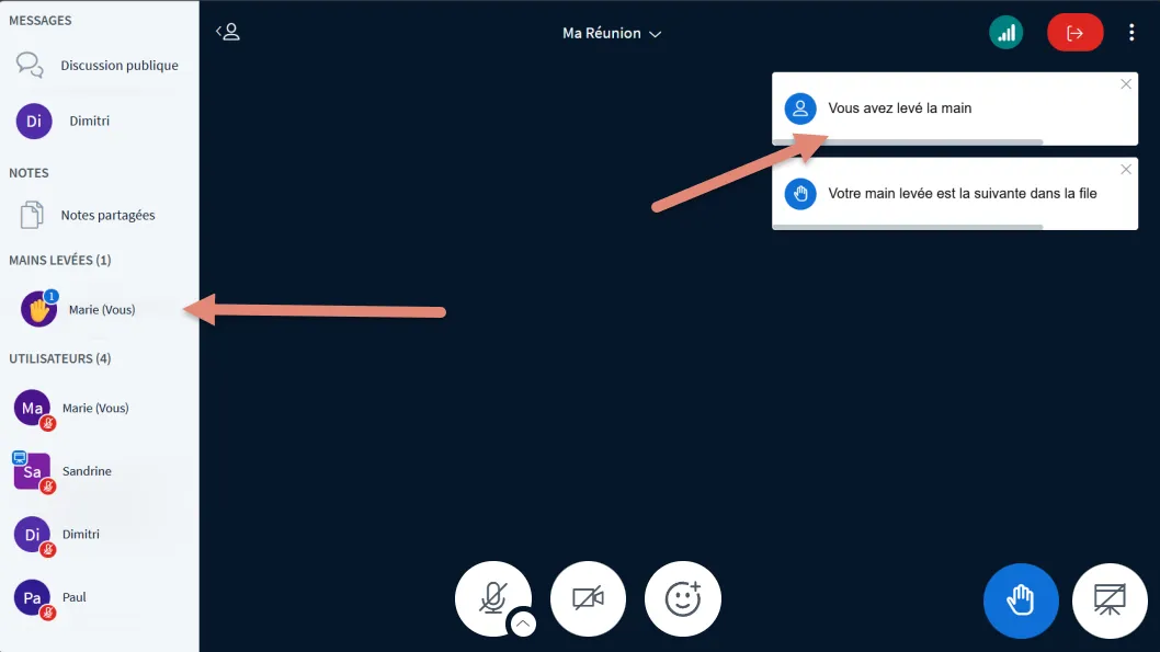 Les participants sont avertis par un signal sonore et par l’affichage de votre nom accompagné de l’icône “main levée” dans la colonne des utilisateurs.