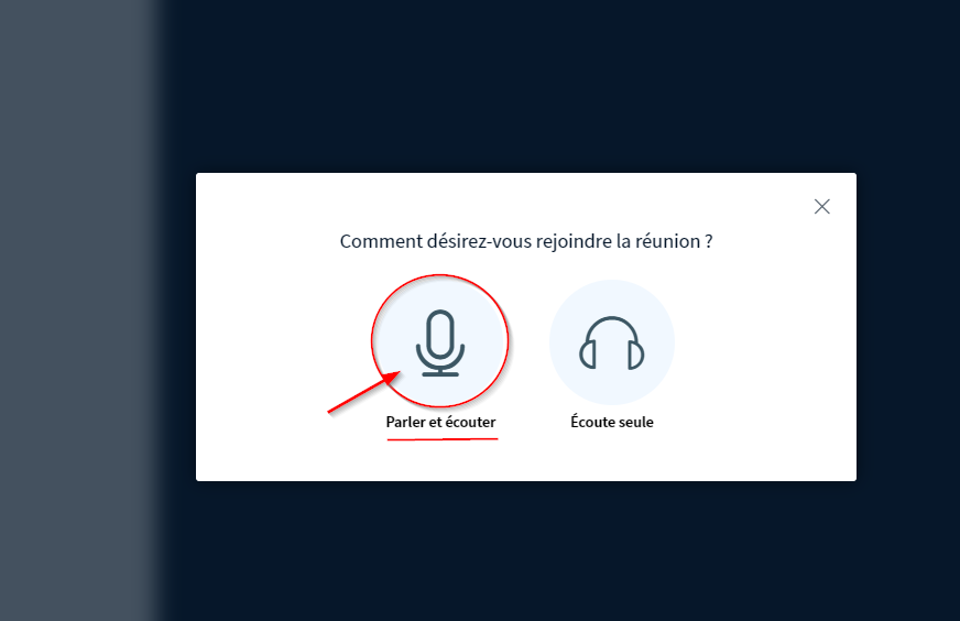 Indiquez si vous allez participer à la réunion en utilisant votre micro ou si vous allez uniquement écouter. Généralement, il est toujours préférable de sélectionner “Parler et écouter”.