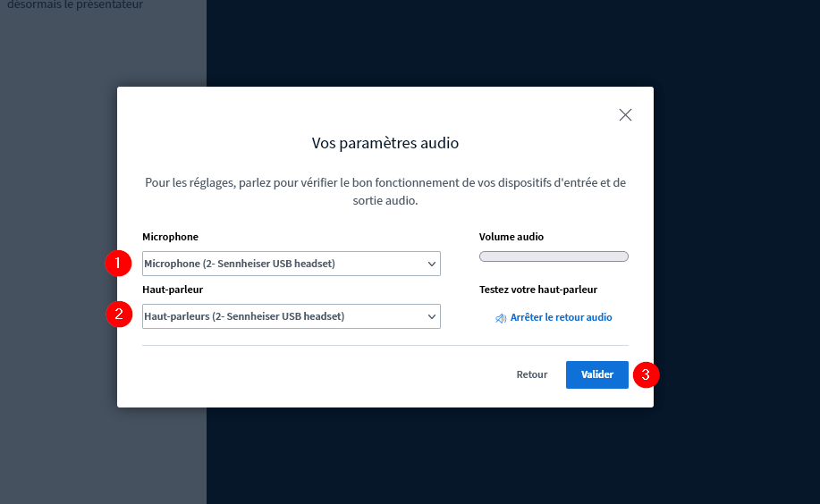 Sélectionnez votre micro et haut-parleur puis parlez pour vérifier que votre micro-casque fonctionne correctement. Puis cliquez sur « Valider » :