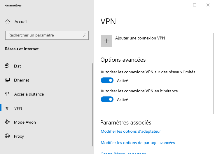 Paramètres de Windows>Internet et réseaux>VPN -