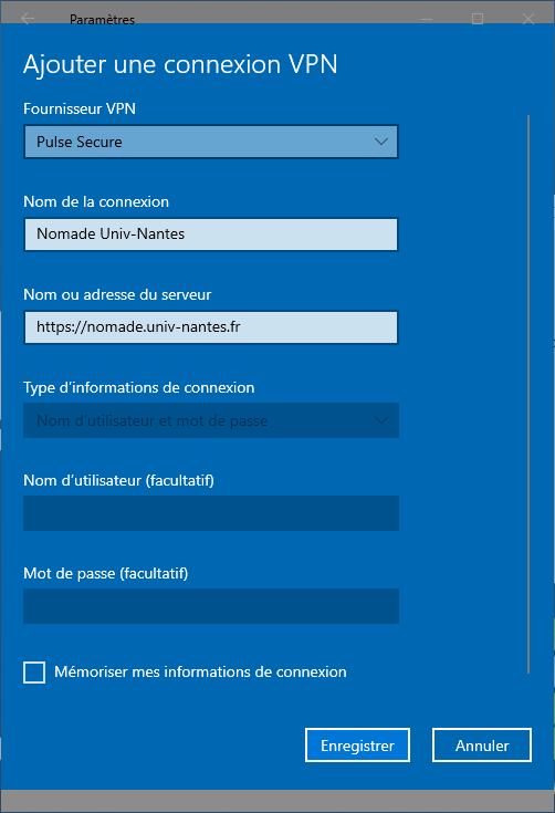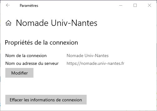 Fournisseur VPN→Pulse SecureNom de connexion→Nomade Univ-NantesAdresse du serveur:- Personnels de l'Université→https://nomade.univ-nantes.fr