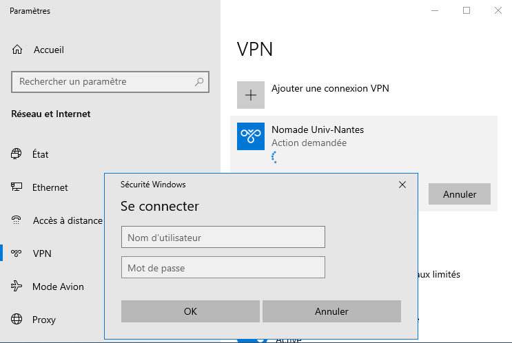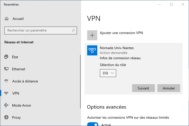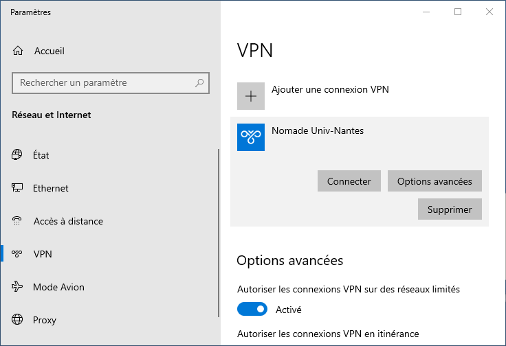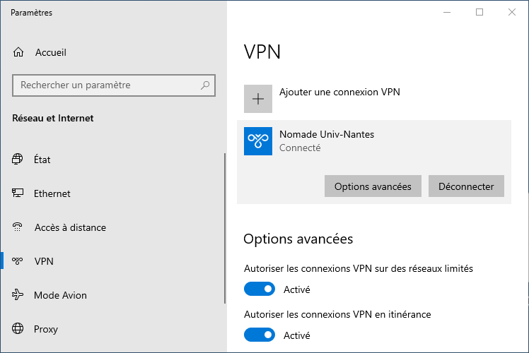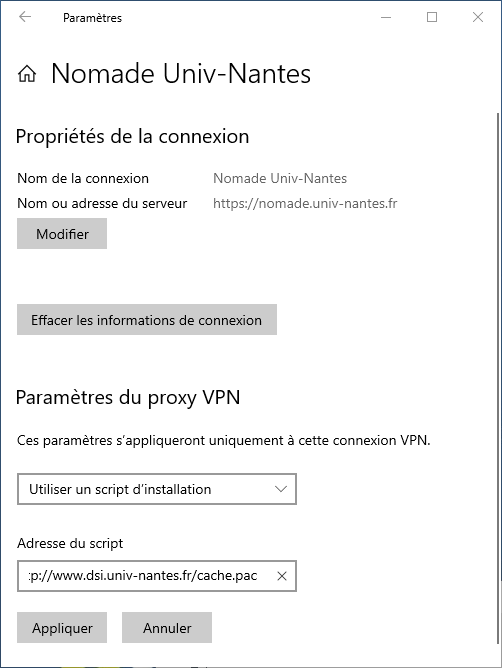 Paramètres de Windows>Internet et réseaux>Proxy. Si ces paramètres ne sont pas configurés, vous pouvez les spécifier pour cette connexion VPN avec le boutonOptions avancéesParamètres du proxy VPN→Utiliser un script de connexionouAutomatiqueAdresse de script→http://www.dsi.univ-nantes.fr/cache.pac