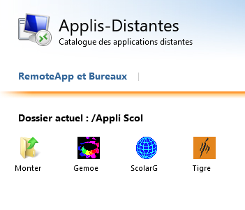 Les raccourcis RDP des applications distantes auxquelles vous avez accès sont classées par dossiers. Dans cet exemple le dossier Appli Scol contient les raccourcis RDP Gemoe, ScolarG et Tigre.