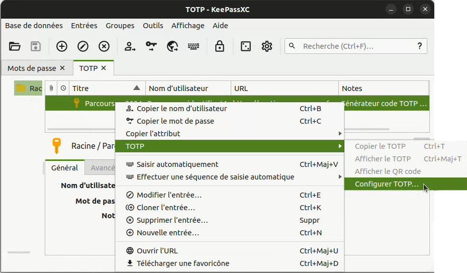 Une fois KeePassXC initialisé, on peut créer une nouvelle entrée (clic-droit ou menu Entrées > Nouvelle entrée ou [Ctrl]+[N]) avec les données issues du QR Code décodé :