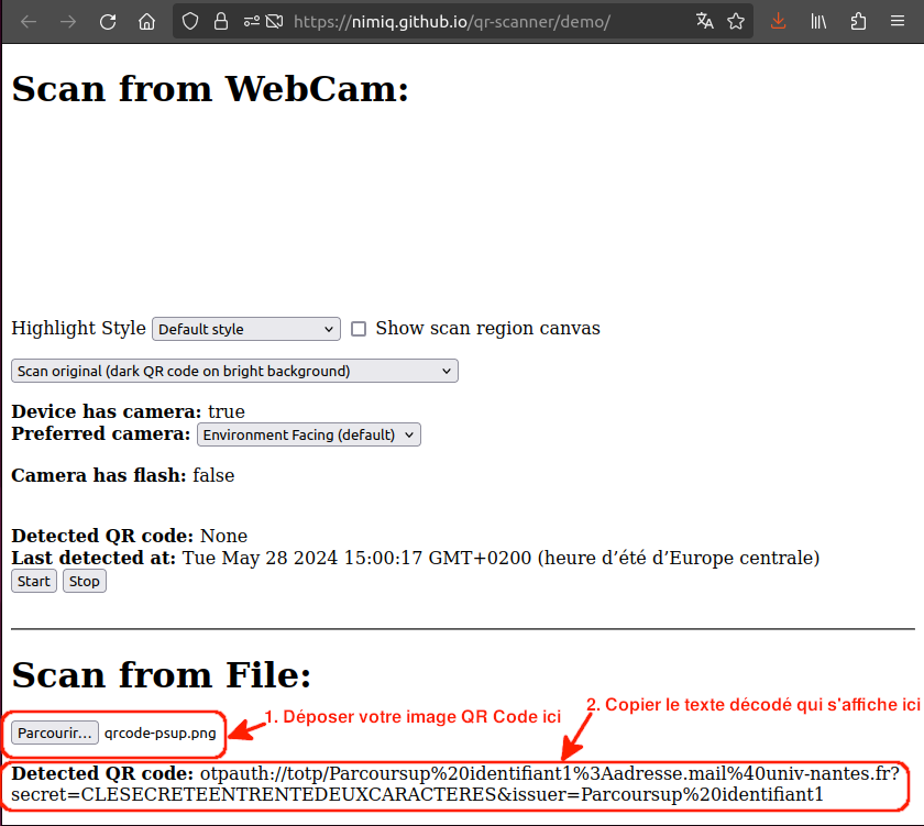 Scanner (si application de smartphone) ou déposer (si site web) l'image du QR Code enregistrée à l'étape précédente et cela génère un texte. Enregistrer ce texte dans un fichier texte. Ce texte est par exemple sous la forme suivante si on reprend les informations de première authentification décrite plus haut :