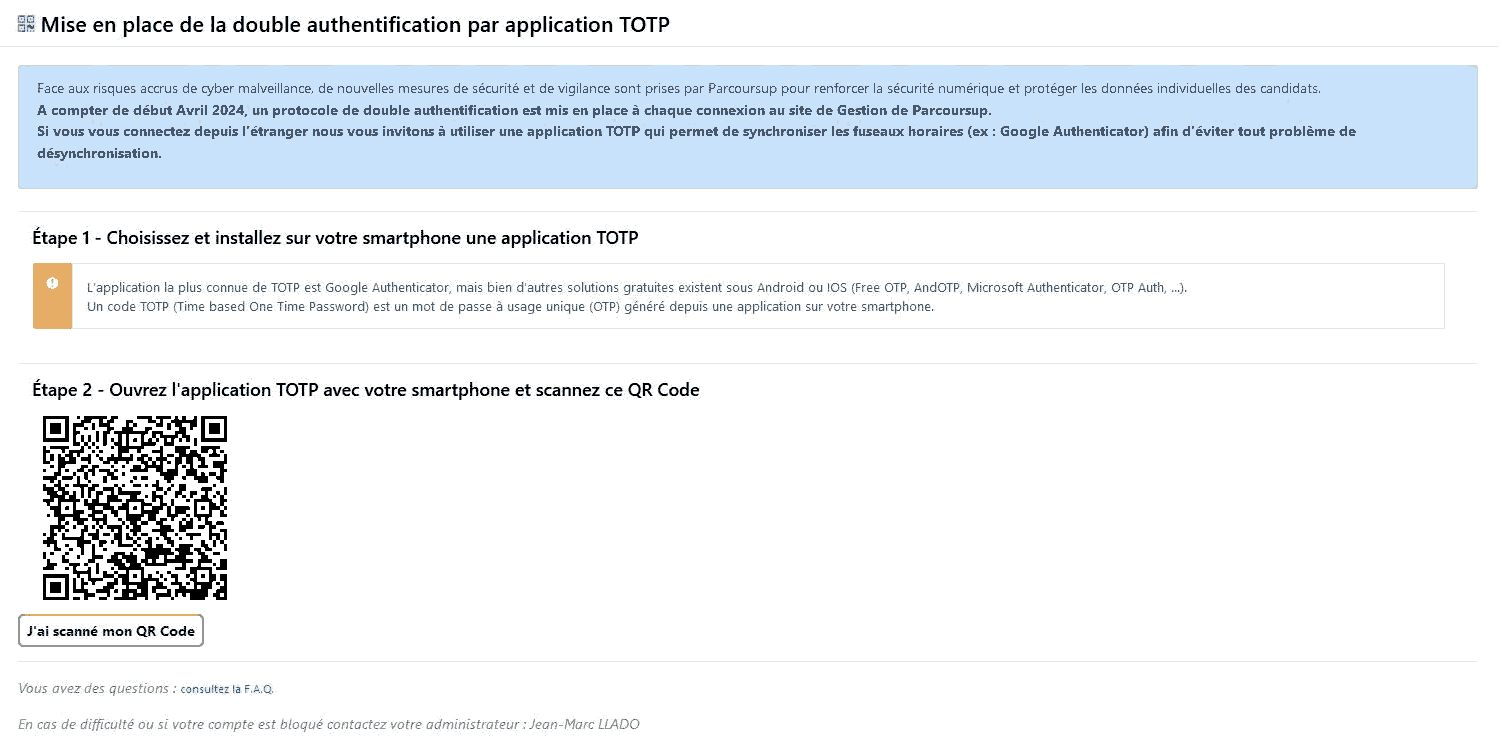 Revenir sur le site web Parcoursup et s'y reconnecter car la session a dû expirer. Si le QR Code s'affiche toujours, cliquer sur le bouton J'ai scanné mon QR Code. Il ne s'affiche alors plus et il est remplacé par un champ de double authentification.